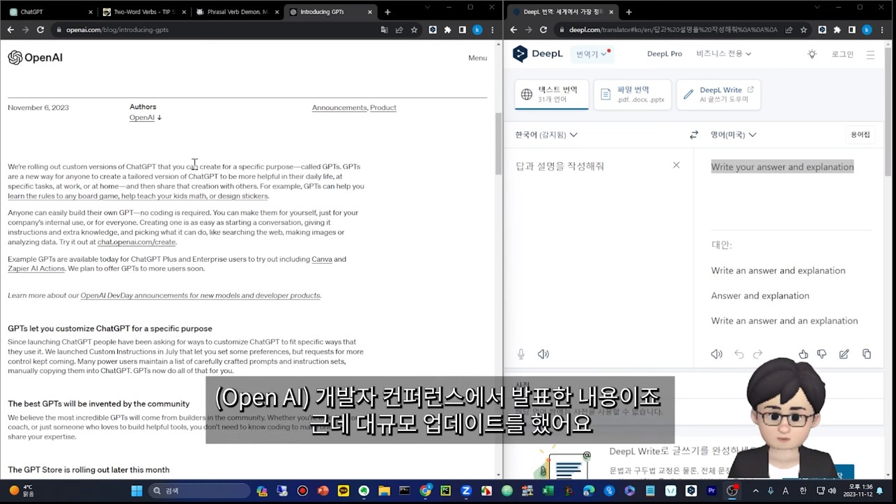 개발자 컨퍼런스에서 발표된 내용은 GPT 4 Turbo라는 대규모 업데이트가 있었다. 이 중에서 GPTs(나만의 맞춤 GPT)를 만들 수 있는 기능에 대해 설명하고자 한다. 맞춤형 버전의 chatGPT를 만들어 일상생활이나 업무에서 활용할 수 있다고 언급하며, 이를 위해 GPT 빌더와 Instructions를 사용하여 구성할 수 있다고 설명한다. 예를 들어, 보드게임 규칙을 배우거나 수학을 가르칠 때 사용할 수 있다고 한다. 이후에는 TOEFL에서 사용되는 two-word verbs를 중심으로 한 예시를 보여주며, GPT 빌더를 사용하여 이를 만들어볼 수 있다고 소개한다. 이후에는 GPT 빌더를 사용하여 새로운 GPT를 만드는 과정을 설명하고, TOEFL의 two-word verbs에 대한 예시를 제공한다. 마지막으로, GPT 빌더를 사용하여 Phrase Master를 만들고 TOEFL 테스트와 관련된 Phrasal Verbs를 설명하는 방법에 대해 소개한다. 이를 통해 개인 맞춤형 GPT를 만들 수 있으며, 예문과 팁을 제공하여 동사의 이해와 사용에 도움을 주는 역할을 한다. 이와 같은 방식으로 GPT 빌더를 사용하여 다양한 형태의 GPT를 만들 수 있다고 설명한다.